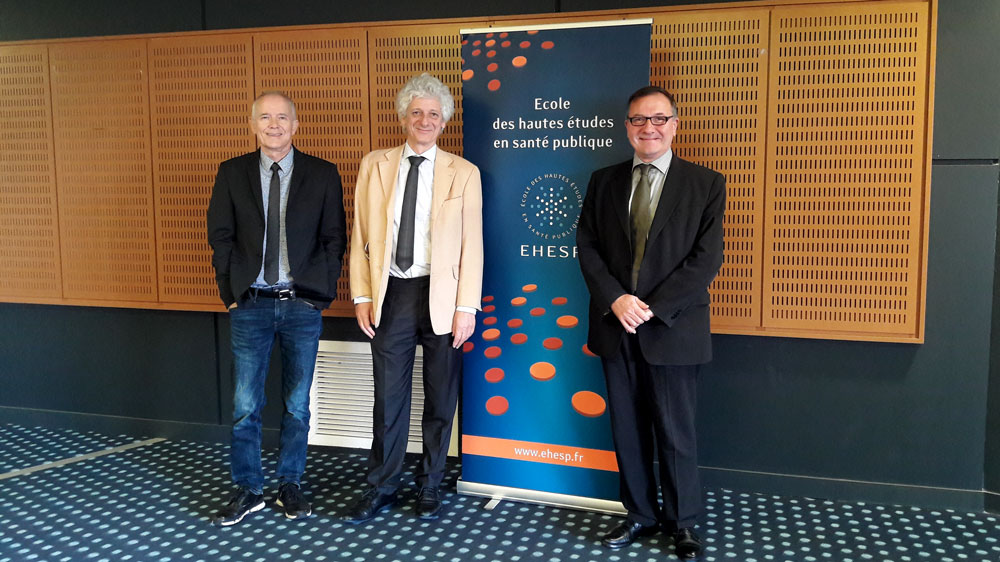 - De gauche à droite : Bernard Jégou, directeur de la reherche et Laurent Chambaud, directeur de l’EHESP aux côtés de Thierry Damerval, président-directeur général de l’ANR le 12 novembre 2019 à l’EHESP – Photo : EHESP