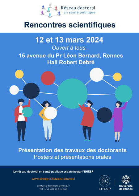 Les 12 et 13 mars 2024, les doctorant(e)s du Réseau doctoral en santé publique (RDSP), les enseignant(e)s-chercheur(e)s de l’École des hautes études en santé publique (EHESP) et des Écoles doctorales membres du réseau participent aux 15èmes Rencontres scientifiques à l’EHESP. Après une ouverture par Isabelle Richard, directrice de l’EHESP, Sylvie Ollitrault et Judith Mueller, directrice et directrice adjointe du RDSP, cette 15ème édition sera organisée autour des présentations orales de travaux de doctorant(e)s et de présentations de posters scientifiques dans une perspective interdisciplinaire. Tous les participant(e)s pourront accéder pendant ces deux jours à un état des lieux de la recherche en santé publique et participer à des temps d’échanges entre doctorant(e)s.