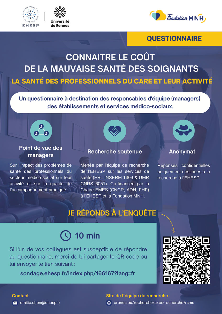 Avec un taux supérieur au milieu hospitalier, l’absentéisme dans les établissements du secteur médico-social représente un enjeu majeur. Selon la même méthodologie, l’équipe du projet VALORIS a conçu un questionnaire en ligne dédié aux professionnels encadrants, coordinateurs et directeurs de structures médico-sociales en France. Une participation massive à cette enquête nationale permettra d’établir, des coefficients adaptés et spécifiques à ce secteur d’activité pour permettre, à terme, une meilleure prise en charge de la santé des professionnels du secteur médico-social.