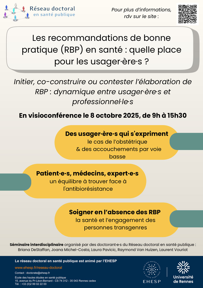 Affiche du séminaire interdisciplinaire des doctorants du RDSP - 8 octobre 2025Les doctorants du Réseau doctoral proposent des séminaires interdisciplinaires, où des intervenants de disciplines différentes peuvent échanger autour d’une question de santé publique. Ces séminaires durent environ une journée, et sont organisés à l’EHESP ou dans les écoles doctorales membres.