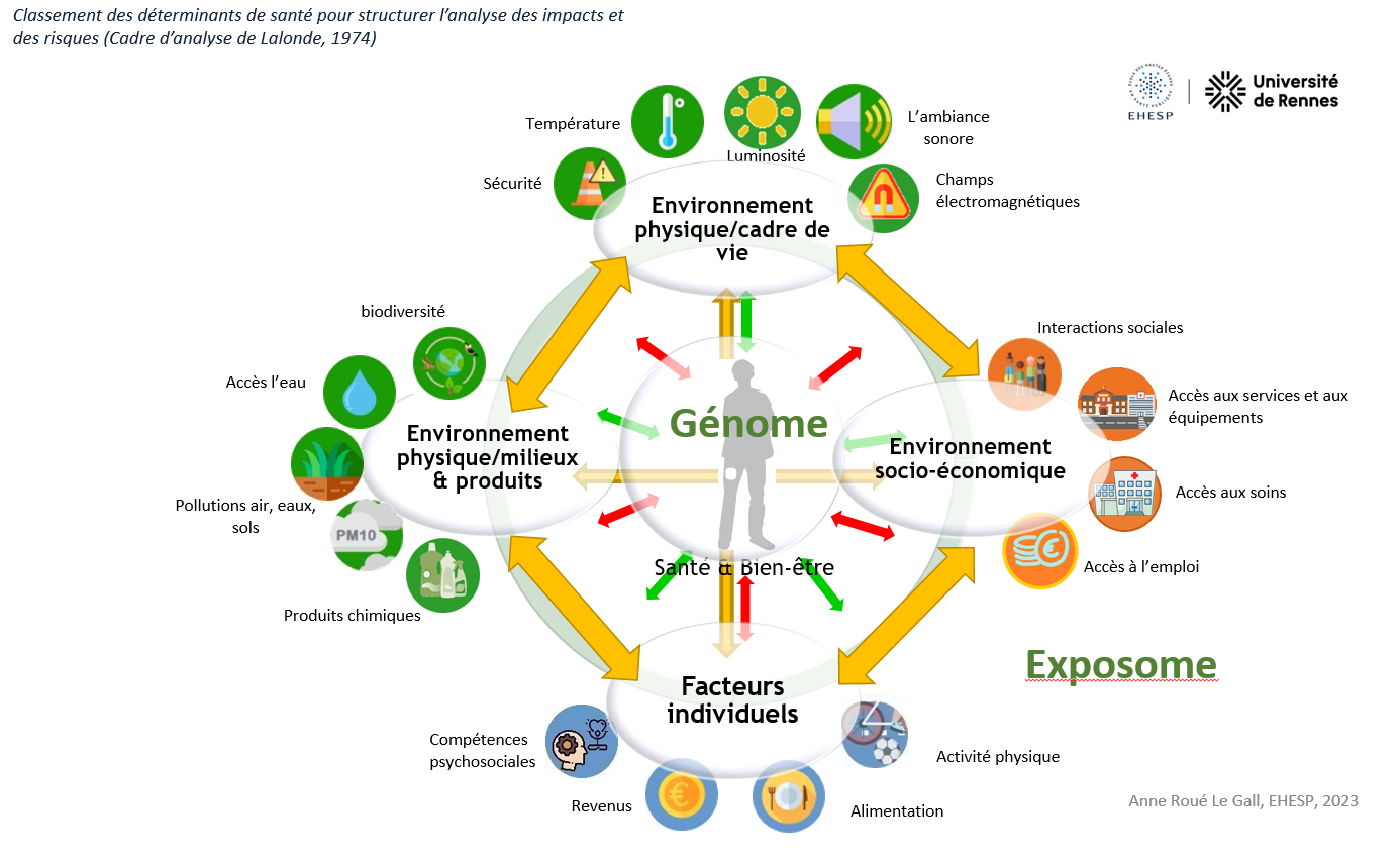 - une approche globale, dynamique et positive de la santé où l’on considère la santé comme le résultat du cumul d’expositions à un large panel de déterminants de santé environnementaux, socio-économiques et individuels, susceptibles d’influencer positivement (facteurs de protection) ou négativement (facteurs de risque) la santé ;